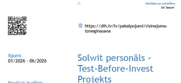 Projekts "Solwit personāls: Test-Before-Invest" ļauj uzņēmumiem izmēģināt personāla vadības sistēmu pirms iegādes. Tā palīdz vienuviet pārvaldīt darbiniekus, darba laiku, atvaļinājumus un algu aprēķinus, padarot ikdienas personāla darbu ērtāku un samazinot ieviešanas riskus.